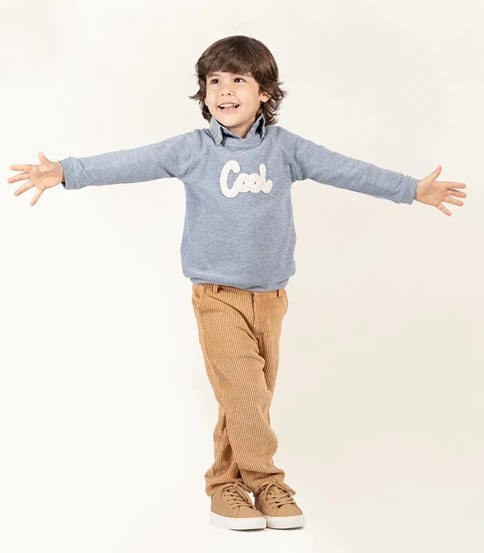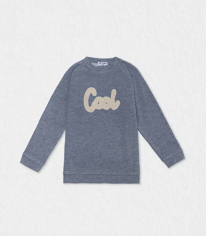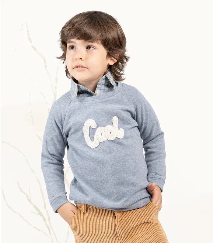 Keep your little one warm and stylish with this cozy boys sweater in a washed blue color, crafted from soft jersey fabric with a plush furry interior for ultimate comfort. The standout feature is the “Cool” front design, made from curly beige mouton fabric, giving the sweater a fun and textured touch. Perfect for chilly days, this sweater combines warmth, comfort, and personality—ideal for everyday wear, school, or play.