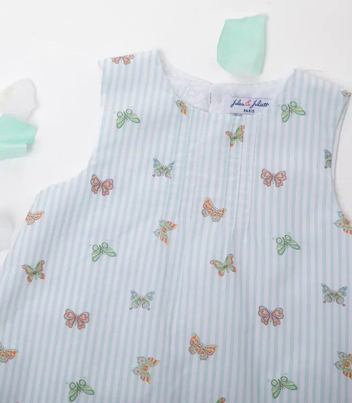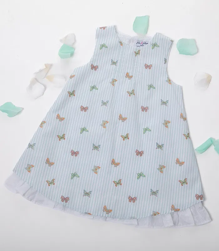 A must-have for the season! Experience the elegance and grace of this beautiful piece from the J&J New Collection. It features delicate, soft ruffled embroidered cotton topped with a premium cotton fabric with butterflies and fastens at the back with four resin buttons.