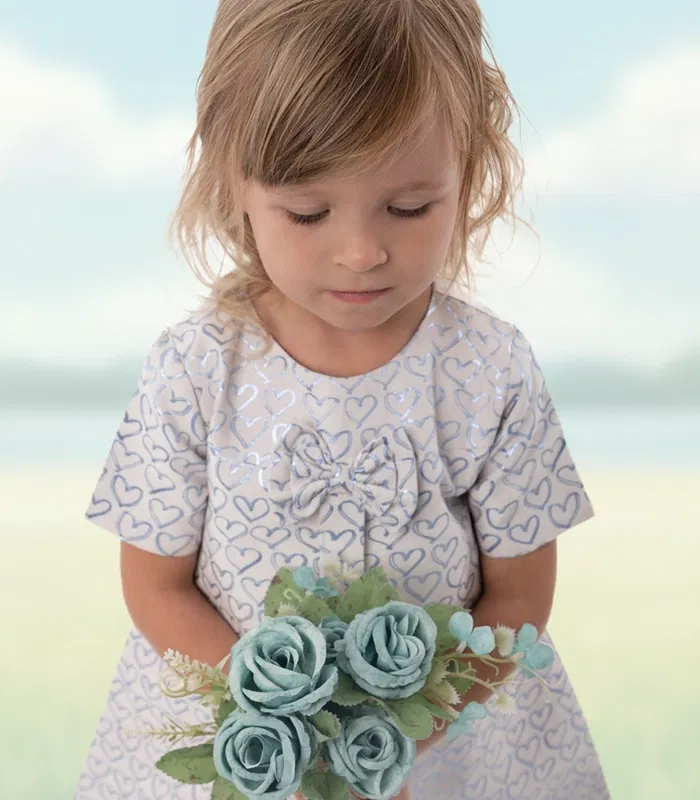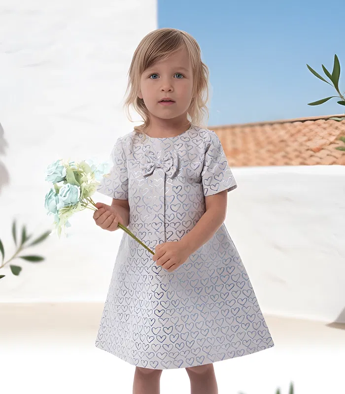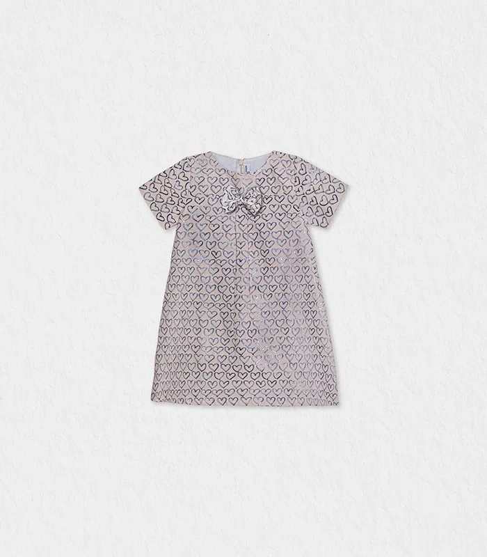 Radiate charm with this elegant A-line dress, beautifully crafted from a luminous metallic fabric. Adorned with an all-over pattern of delicate hearts, it features a signature double-knot bow at the neckline for a touch of artisanal flair. With its subtle shimmer and classic short-sleeve silhouette, this dress is a perfect choice for sun-drenched celebrations and special summer moments.