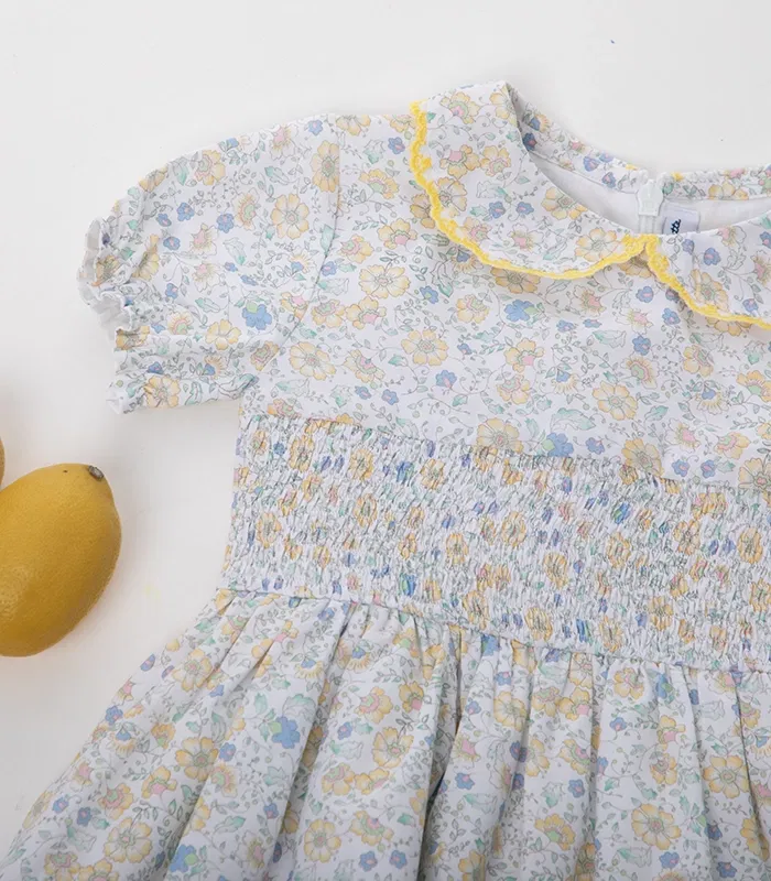 A summery dress for any occasion! Featuring a fresh flowery fabric with delicate smock on the front chest and embroidered collar with beautiful flowers, this dress is the must have for your little girl this season!