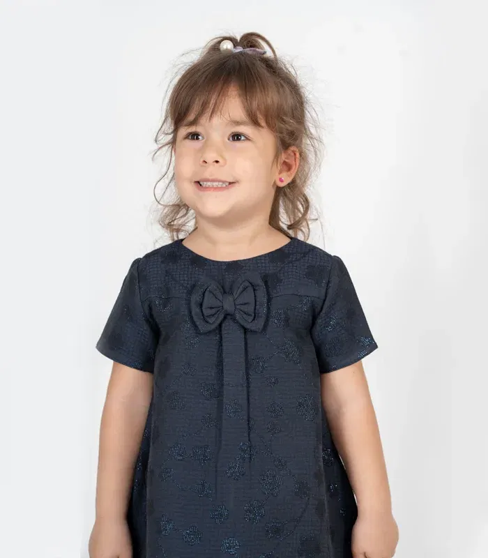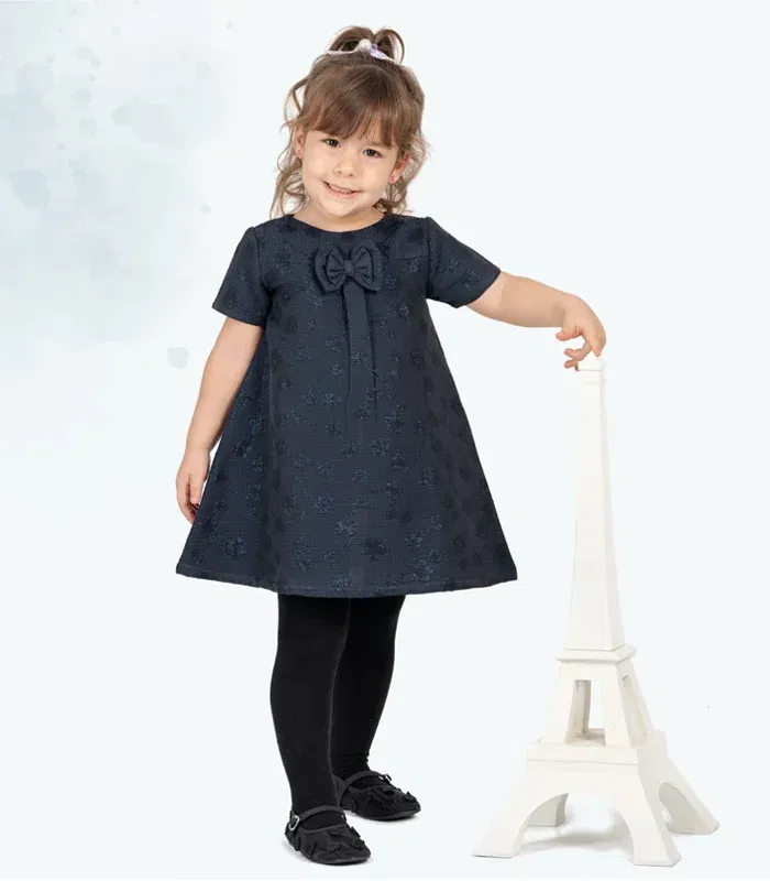 Add a touch of sophistication to your little one’s wardrobe with this stunning navy blue jacquard baby dress, expertly crafted from rich jacquard fabric. Featuring delicate floral patterns woven with shiny metallic threads, this dress beautifully captures the light, creating an elegant sparkle that’s perfect for special occasions.