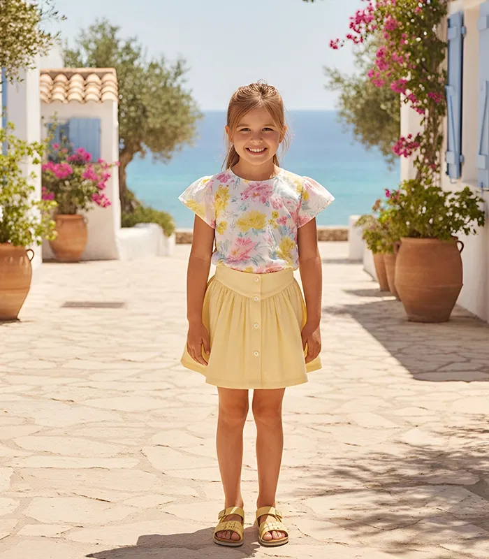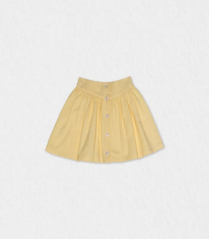 Brighten her wardrobe with the Edena Skirt, a breezy and cheerful essential designed for sunny days. Crafted from a soft, textured fabric in a gentle pastel yellow, this skirt features a classic A-line silhouette with elegant front-button detailing and delicate pleating for a full, playful volume. Whether she’s heading to a birthday party or a weekend outing, it pairs effortlessly with our signature J&J blouses or a simple tee for a look that is both comfortable and timelessly chic.