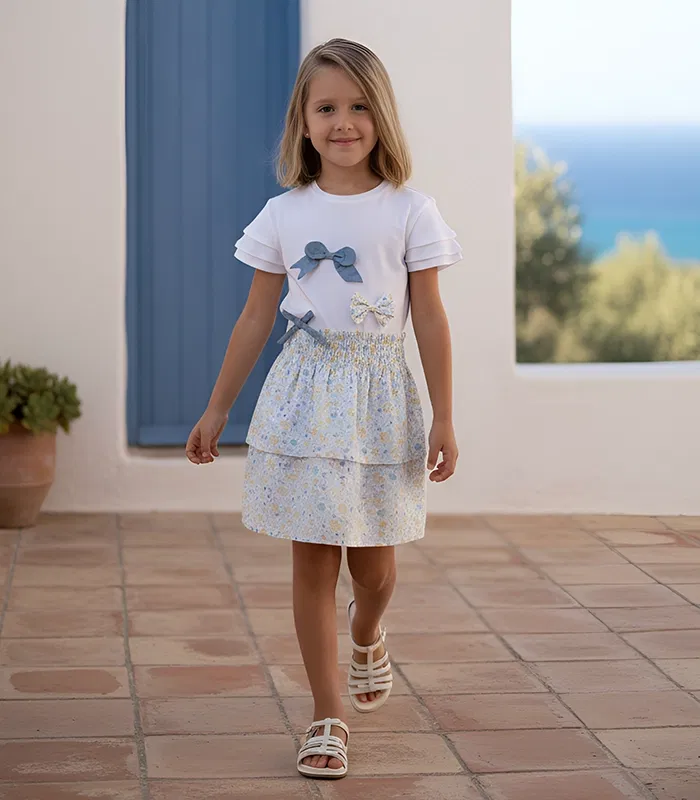 Add a touch of refined charm to her casual wardrobe with the Ebony T-Shirt, a versatile staple designed to bridge the gap between sporty comfort and chic elegance. This piece is defined by its unique layered sleeves, which add a soft, sophisticated volume to a classic silhouette. A jean bow sits gracefully at the center, providing a gentle pop of color that pairs beautifully with our seasonal prints. Crafted for ease, the T-shirt features a practical back opening with two buttons, ensuring she stays comfortable from morning play to evening strolls.
